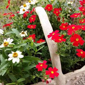 サンブリテニア スカーレット🌿 見切り品 120円、夏の暑さに負けず咲き晩秋まで楽しめます🌿 冬に編んだ籠に植えてみました🎵