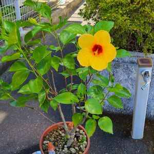職場の鉢植えの「ハイビスカス イエロー」、毎年今頃から12月まで次々と咲きます。もう一回り大きい鉢に植え替えた方がいいのかな?