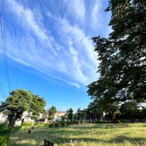 朝空と公園 この時期は市が草を刈ってくれるけど すぐに伸びてしまう 大人の膝丈になると遊ぶ子おらず 朝は野良ニャンコの庭となる 今朝はベンチの下に🐈