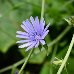 涼しげなお花をもうひとつ✨🎶 青紫のニガナみたいなお花のチコリです💙💜✨🎶 チコリ キク科 キクニガナ属 ヨーロッパ原産 和名はキクニガナ(菊苦菜)で、キク科の野菜で葉に苦味があることから名付けられている。 近縁種であるエンダイブとチコリーは、互いにしばしば混同される。 開花期は7月 - 10月で、花は頭状花で、青紫色や白色の花弁をつけて咲かせ、朝に開花してその日の昼過ぎには萎んでしまう。 頭花の径は3 - 4 cmで、花より短い苞葉に包まれる。 通常は薄紫色または水色の花色が多く、稀に白色や淡桃色もあるがめったに見られない。 2列の内反苞葉のうち、内側は長くて直立しており、外側は短くて広がっている。