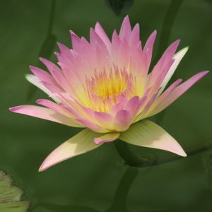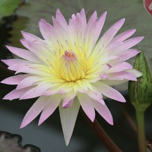 おはようございます♪ 神代植物公園にて 新品種の熱帯スイレン 💕デー・グロー💕 花は中心部が濃い黄色で花弁先がピンクとなる複色種 細長い花弁をカップ状に咲かせ、花弁数も多いので豪華な印象がある 🍃葉はグリーンからやや褐色がかり、茶色いドット状の模様が入る。