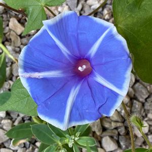 軒下の砂利から 縁が白い朝顔が 葉っぱもあまりないのにいきなり可愛いいお顔 ど根性朝顔ですね✌️✌️✌️💪💪💪💙💙💙