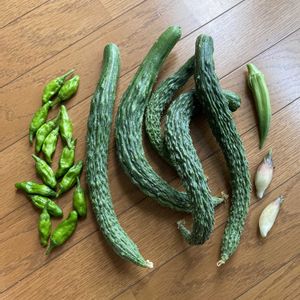 画像1/今日の収穫 画像2/収穫間近のナス♪ 画像3/原種オリズルラン♪ ランナーが伸びてきました〜 画像4/松葉牡丹♪ 仲良く2色咲きました〜 画像5/カーネーション♪ そろそろ剪定したほうが良いのかな…
