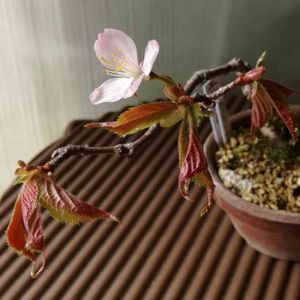 咲いた‼️去年棚入れしたものだけど、鉢物の蝦夷山桜は咲かないだろうとたかをくくっていたのに、ヤッター🎶🤣