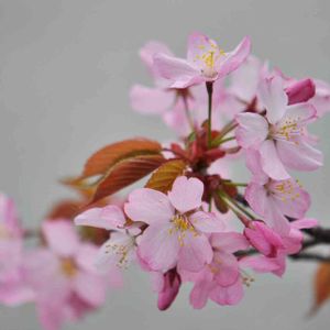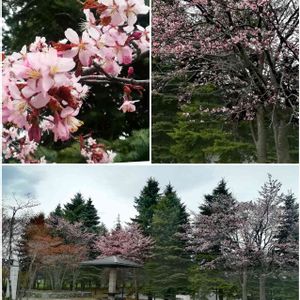 青空に映える濃いピンク色の花びら。 北海道の桜と言えばやっぱり蝦夷山桜。 艶のある美しい枝、花と同時に出てくる赤みのある新葉も可愛らしい花たちを惹き立てています。 *バラ科サクラ属 *別名:大山桜、紅山桜
