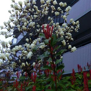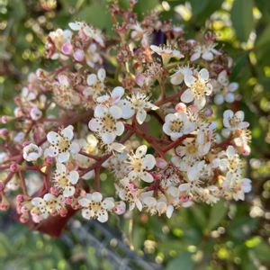 暖かいので近所散歩中 生垣のレッドロビンに花が咲いていました??