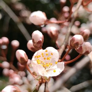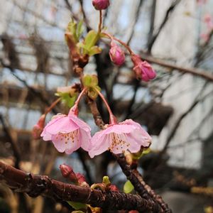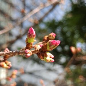 お昼休みのお散歩🎵 河津桜のつぼみ🌸 ちょっぴりピンクが見えるよね?🐰💕 お詫びと訂正 桜の名前を間違えていることに気付いたため「大島桜」から「河津桜」に訂正させていただきました。 すみません🐰💦⤵️