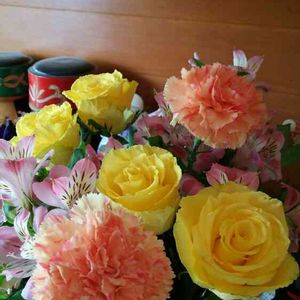 結婚式に娘から貰った花束💠黄色い薔薇は一本挿し木にしてみました😊つくと良いなぁ🌹