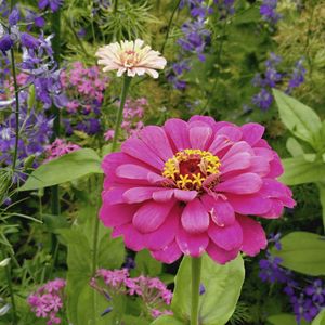 久しぶりに近所の 花壇をのぞいたら、もうジニアが きれいでした 名前が分からない花もたくさん🍀🌸