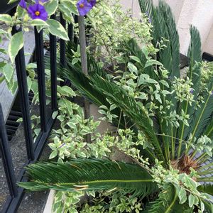 ソラナムちゃん、ちょっと元気よすぎて、ソテツ君が、、、ガマンしているように見える⁝〜😆🍀🌵🌿💜