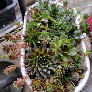センペル寄せ植えを少し風通し良くしました😀🩷(風通し良くない時の写真です) ハッキリと名前の分かるセンペルは、モアハニー、チョコチップ、ユートピア、スプラッシュです🧐 🏷️日曜日はセンペル💕