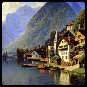 [お絵描きばりぐっどくん] 10K,高品質,写実的,油絵, 風景画 , リアル, 絶景, ヨーロッパで最も写真に撮られた場所”とも呼ばれる湖畔の街, 16世紀に建てられたアルプスの家々, ハルシュタット,オーストリア, イワン・クラムスコイ