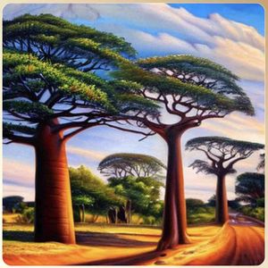 [お絵描きばりぐっどくん] 世界の絶景スポット 10K,高品質,写実的,油絵, 風景画 , リアル, 神秘的,バオバブの並木道, 日没前の時間帯の光景,マダガスカルの絶景