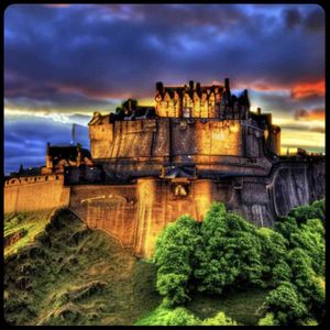 [お絵描きばりぐっどくん] 世界の絶景スポット 10K,高品質,写実的,油絵, 風景画 , リアル, 絶景スポット, エディンバラ城,スコットランド,ヨーロッパの名城,夕暮れ,幻想的