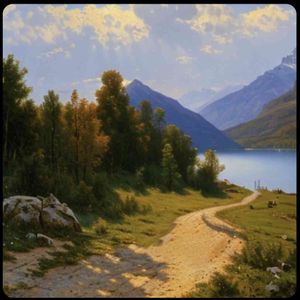 [お絵描きばりぐっどくん] 8K,高品質,写実的,油絵, イワン・クラムスコイ, 風景画 , リアル, 青空,湖,山並み,ロマンチック街道,ドイツ