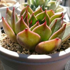 Echeveria RudolphNo.3♡゛ 購入先で… 『深い緑と真紅のコンビネーションが とても印象的でパッと目を引きます まさに薔薇のようでドレスアップした 女性のイメージです 真っ赤なリップやハイヒールを連想させる 大人に多肉ですね』 と紹介されていたけど…もう本当にそう!!! とても魅力的で即決してしまいました^^ No.3という事は…No.2やNo.1もあるのかな???
