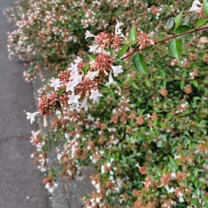 道路脇のアベリアの花 君たちの命はあとわずかだよ チェーンソーみたいなので刈り込みしてる人が迫ってるからね 年に一度の試練 こんな時期にスッカスカな丸坊主にされてもワサワサになるんだから 生命力すごいね