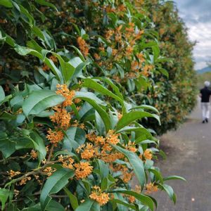 窓を開けるとキンモクセイの香りがします 見える範囲には植えられてないのですが picはずーっと続く公園のキンモクセイ並木です そばに寄っても 風上だと意外と香りません