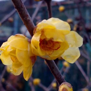 ロウバイ 花に興味 なかった頃 老梅と 思ってた私😅😅 2年前本体が 枯れて ヒコバエを伸ばして やっと今年咲きました 蝋細工のような お花綺麗じゃ〜 ٩(๑´0`๑)۶
