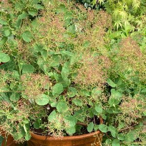 スモークツリー、半分くらいスモークしてます。 ここまで来るのに四年かな? 日当たりが好きだが、水切れに弱く毎日たっぷり水をあげます。