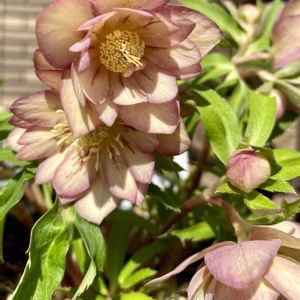 午後の玄関先より ꕤ クリスマスローズ ꕤ 広瀬園芸さんのアプリコットのダブル🌸 小輪のお花が可愛い子💓 ①〜②は日向で撮影☀️ ③〜⑤は日陰に移動して撮影しました😊♪♪