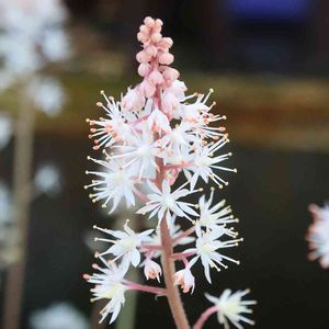 【ティアレラ ・ピンクスカイロケット】 北アメリカ原産、ユキノシタ科多年草 花期になると、長く伸ばした茎の頂部に総状花序を出し、花径1㎝程度の花を多数咲かせる。 花は多数の花弁があるように見えるが、半分は萼片で、5枚の萼片の間に、細い5枚の花弁がある。 花序の下から上へと咲き進む。 「ピンクスカイロケット」は、淡いピンクの花を咲かせる代表品種。 草丈:25~40cm 花期:4~6月 花色:ピンク、白 やまぐちフラワーランド@柳井市