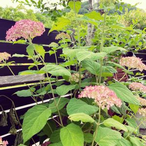 ピンクアナベル、ヘイズスターバースト💚 挿し木で増えたこの二つ、ベランダのあちこちでコラボしています😊