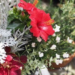 コンパクトタイプの 小さなハイビスカスが可愛いくて シルバーリーフと夏らしい寄せ植えに🌺