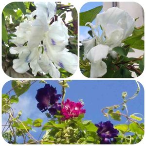秋晴れに咲く変化朝顔 零れ種からここまで咲くとは、‼️ 今年は真っ白の一輪に変化が 少し紫が入っています😇