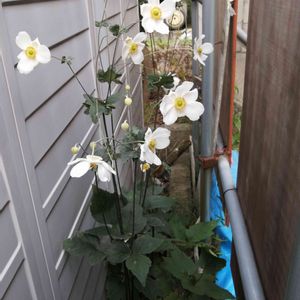 庭のアチコチに出没して他の山野草を駆逐するので、数年前に駆除したシュウメイギク🌼 ウチの物置(左側)と隣家の塀の隙間でこっそりと咲いてました🌸 狭い所だけどのびのびと咲いてます💓💞 2022秋の十草に参加。