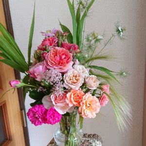 バラで連投します*ᴗ ᴗ)⁾⁾♡ 庭の綺麗どころを集め、やっとこれだけ…😅 ラデュレ、いおり、アプリコなど🌹 グリーンはワイルドオーツ、麦の穂みたいなホルデュー厶ジュパタム🌾 セアノサスマリーサイモンもカットしました〜💐