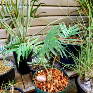 ■Macrozamia moorei ・マクロザミア ムーレイ AIに聞いてみました↓ マクロザミア・ムーレイは、ソテツ科マクロザミア属の植物で、オーストラリア原産のソテツの一種です。 特徴: * 美しい葉: 長く美しい葉を持ち、その姿はヤシの木にも似ています。葉の色は青みがかっており、独特の美しさがあります。 * 成長が遅い: 生育が非常に遅く、鉢植えでは10年経っても20年経ってもほとんど変化がないほどです。 * 幹立ち: 幹が立ち上がった姿が魅力的で、日本でも植物園などで見ることができますが、非常に珍しいものです。 * ワシントン条約: ワシントン条約の付属書Ⅱに属しており、国際的に保護されている希少な植物です。 * 中生代を彷彿: 中生代のジュラ紀や白亜紀の雰囲気を現代に伝える存在感があり、その姿から太古のロマンを感じることができます。 特徴をまとめると: * 学名: Macrozamia moorei * 原産国: オーストラリア * 耐寒性: -5℃前後 * 生育速度: 非常に遅い * 特徴: 美しい葉、幹立ち、ワシントン条約 その他: * 用途: 南国ムードを演出するシーンでよく利用され、庭や鉢植えなどで楽しめます。 * 入手性: 比較的入手しにくく、価格も高価な場合があります。 注意点: * 水はけの良い場所を好む: 水はけが悪いと根腐れを起こすことがあるので注意が必要です。 * 成長が遅い: すぐに大きくならないため、根気強く育てる必要があります。 最高気温22℃、最低気温18℃