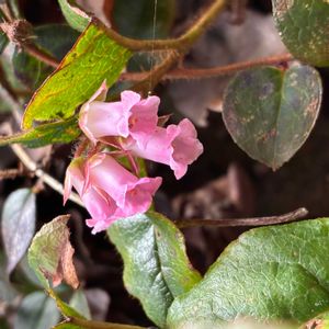 イワナシ(岩梨) ツツジ科イワナシ属 常緑小低木 大きな葉の下に隠れて咲く真っピンク色の キンギョみたいな花🩷 岩の間で10〜15mmほどの花をつけてました GSの皆さまに教えていただき、いつかこの目でみたいな と思っていて初めての嬉しい出会いでした! 不思議な名前と調べたら実が梨の味がするからとか? 食べたことある方!ホントですか?😙 2025.04.19 坂戸山にて