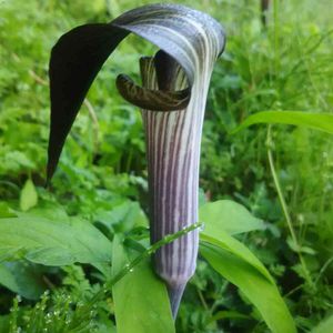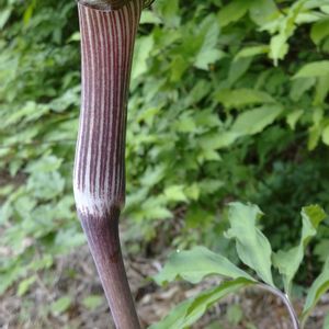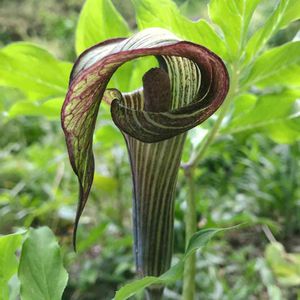 紫蝮草 ムラサキマムシグサ🌿💜🤎 里芋に似た芋は毒があるそうで 茎のマムシ模様といい怖いイメージがあります