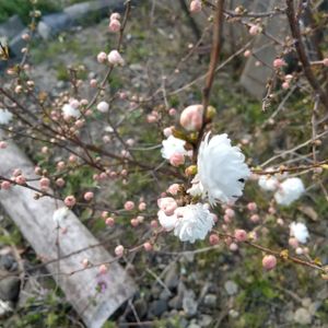 散歩途で見かけた白い花。 小さな、低木に咲いていました。 蕾が薄いピンク色 なんの花でしょうか❓