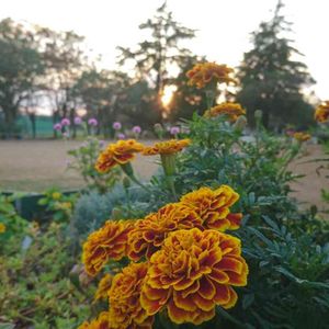 傾く日射しに輝くマリーゴールドとセンニチコウ