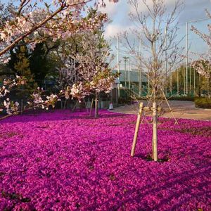 帰り道の寄り道。 新しくなった母校の学校の正門・・・・桜と芝桜が新入生を、歓迎しているようでした❗