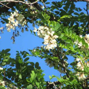 帰り道の寄り道散歩 足元に白い小さな落ち花がいっぱい・・・・ 上を見上げると、ニセアカシアの木に花がいっぱい咲いてました。