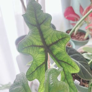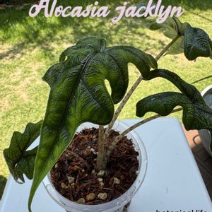 大好きなアロカシアです。 ジャックリン(ジャクリン)です。 サトイモ科アロカシア属で、Alocasia Porteiの突然変異種と言われています。 何と言っても、葉形がユニーク! エンボスの質感もステキ! 若干ケバケバしてるのもキュート! でっかく育てたい!