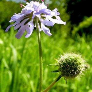おはようございま〜す♬☔️ ⚠️大雨、濃霧注意報発令中! ✿マツムシソウ花と果実✿ 名前の由来:松虫の無く季節に咲くからという説と、花弁が散った後の果実の形が僧侶の持つ松虫鉦(まつむしがね)に似ているからだという説の二つがあるそうです🤔 写真は日本固有種で花期は8月~10月、薄紫の美しい花の「タカネマツムシソウ」と思われます🌱 花言葉:悲しみを表したものばかりでした...😭💔 📷:2018.8.19 ☀️野草園 皆さん良い一日を🤗