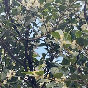 ひいらぎ(1.2枚目)と皇帝ダリア モクセイ科モクセイ属の常緑樹 小さな白い花が集まって咲いています。 皇帝ダリアはたくさんの蕾をつけて花を開かせています。 今日は晴れの予報☀️ 良い一日を♪
