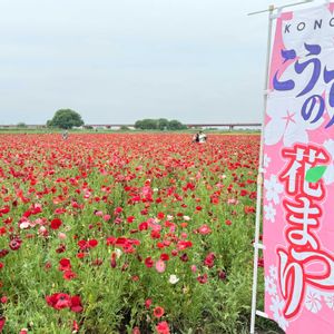 埼玉県鴻巣市荒川河川敷のポピー・ハッピースクェアに行って来ました。 約12.5ヘクタール(東京ドーム2.5個分)で日本一の広さを誇り約3,000万本のポピーが栽培されています。 又この花畑は「日本一の川幅」を誇る(2,537m)荒川河川敷に広がっています。 こうのす花まつりは既に終了していましたがポピーの摘み取りが出来ました。