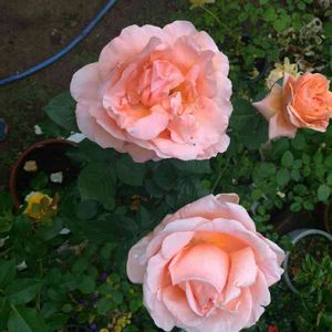 ❝ 薔薇 アベイ・ドゥ・クリュニー & クレマチス ダッチェス ・オブ・エジンバラ ② ❞ ❛ 雨上がりの曇り空からの朝陽を浴びて ❜ おはようございます! 撮りたてです! 生憎の曇り空ですが、淡い色合いのこの二つの花の撮影環境としては悪くないのでしょうね?! 皆さん!、❝STAY HOME❞!! ちからを合わせて! 頑張りましょうね!! 昨日のこのカップルの写真はやはりフライングになって仕舞いました。。。 昨日は夕方から今朝に掛けて、まとまった雨降りになりました。 薔薇は全て地植えなので、雨曝しの薔薇・モナリザは立ち直れないような今朝の姿でした。。。 アベイ・ドゥ・クリュニー含むハイブリッドティー5株は屋根庇が被る東向き花壇に植えていましたので、風雨に耐えることが出来ました。 マイガーデンでの今季4番目に咲いた薔薇は アベイ・ドゥ・クリュニー でした! 3番目のモナリザとオレンジ/アプリコット系と 同系色がたまたま続いています。 ダッチェス ・オブ・エジンバラ は アベイ・ドゥ・クリュニー が咲くのを待ってくれています。 モナリザに似たアプリコット系の色合いですが、撮影時のホワイトバランス調整で実際の色合いに最も近い写真を投稿に選んでいます。 この選別作業が撮るより手間掛かっていましたので、古いPC画面で拡大して確認するのは止めて、EOS Rのバリアングル液晶モニターだけで選びました。 PCやiPhoneとも映りが違うので何を基準にするかで色合いの判断は変わってしまうところです。 また、❛アベイ・ドゥ・クリュニー❜ はGSでは私以外には先に一名のユーザーさんのフランスと思われる場所で撮られた写真しかヒットせず、GSでは珍しい品種になります。 撮影日:2020年5月6日 早朝 100mm(=実効)のマクロレンズでの撮影
