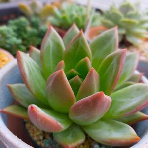 我が家の古株樹氷。 水をあげるとすぐ徒長するので、水捌け良過ぎる土な上に冬のため水やりほぼ無しのかなり過酷な環境です( ̄▽︎ ̄;) 写真はちょっと水あげたからシワシワが無くなったタイミングでパシャリ(笑) 紅葉すると可愛くて大好きな多肉ちゃん♡