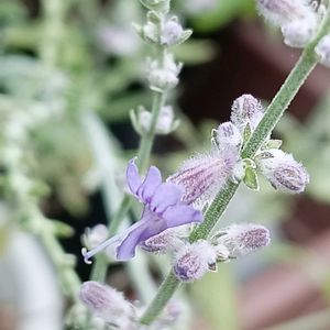 月見月・令和物語✨✨✨ 💜💜💜 おはようございます·̩͙꒰ঌ( *´꒳`*)໒꒱·̩͙、 先月 ホームセンターの園芸コーナーで 枯れたロシアンセージ(6.5号鉢)を 50円で購入しました。 復活は無理かなと思いつつ 大事に育てたら 花が咲きました⤴⤴⤴ 嬉しくて 何度もパチリんこして ( ≖ᴗ≖)ニヤッってしてるꉂꉂ🤭 白狼会系庭組に お迎えしたロシアンセージたん(*ˊ˘ˋ*)。♪:*° ちっけー漏斗形の花が かーいーねー♡♡♡ 2025/08/16 撮影