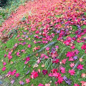 一面 苔 しっとり艶々のグリーンに 可愛い紅葉が彩りを添え 素敵なフカフカの絨毯に この上に 大の字になりたい\(^-^)/ 苔と紅葉落ち葉🍁のアート