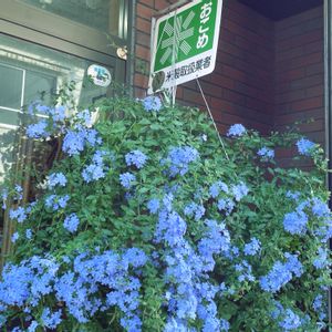 出勤途中で 何時も通るお米屋さんの店頭に、色の濃いルリマツリが満開です。