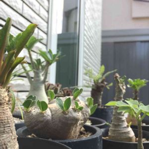 長雨が続いております‥☔️ そんな中久しぶりの一瞬の晴れ間☀️ 素直にうれしい❗️ Pachypodium gracilius(パキポディウム・ グラキリス) Pachypodium baronii var. windsorii(パキポディウム・ウィンゾリー) Euphorbia primulifolia(ユーフォルビア プリムフォリアー地むぐり 花キリン)