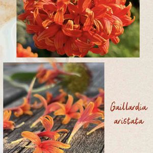 ガイラルディア ガリア オレンジスパーク 1️⃣ 庭の端のポイ捨て場に➰ポイしたら根付いてしまったオレンジスパーク🧡 2️⃣ 見に行ったらお花が増えていました。 (上)庭から… (下) 敷地外にしだれてたくさん咲いていました🧡🧡🧡