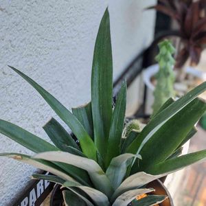 パイナップル😋 トップのチビ葉っぱは成長して なが〜くなり 中で新芽も待機中😚 元気いっぱいだ💕 は〜、よかった😩 とりあえず定着は成功かな あと2年? 3年? がんばれ、あたし❣❣ 😁